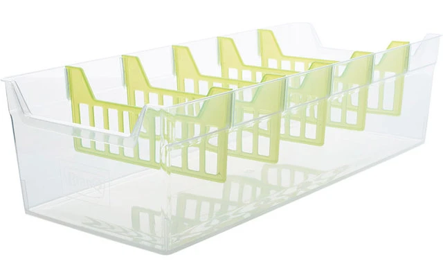 Leichter Gewürzbehälter zum Sortieren und Aufbewahren von Gewürzenstreuern oder Nachfüllpackungen. Mit herausnehmbaren Trennern zur idealen Bestückung.