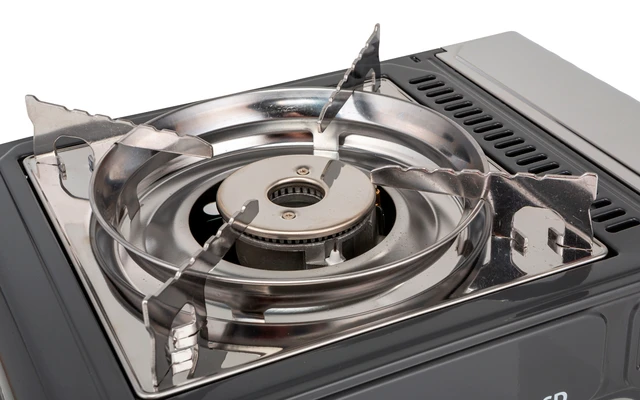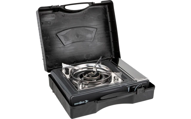 Kartuschen-Gaskocher mit Zündsicherung, integrierter Piezozündung und Alu-Brenner. Die Gaszufuhr ist regelbar. Der Kocher wird inklusive Transportkoffer geliefert und der Betrieb erfolgt mittels Gaskartuschen.