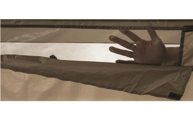 • Die Netztür kann für eine dichte Abdichtung mit einem Reißverschluss an der Bodenplane befestigt werden