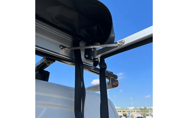 Es handelt sich um ein kleines, tragbares Zelt, das in wenigen Minuten direkt auf dem Dachgepäckträger des Fahrzeugs befestigt wird.