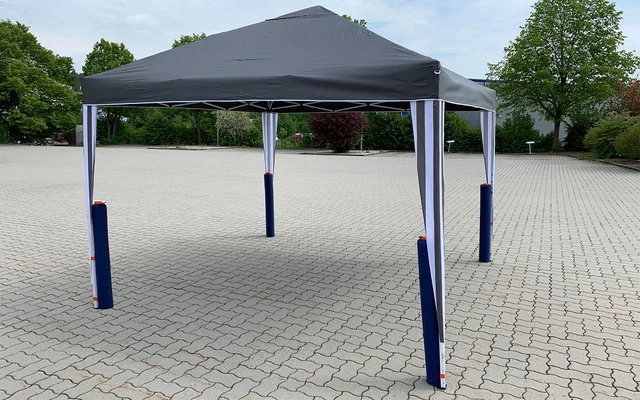 Den Schlauch mit 10 Liter Wasser befüllen und innen an das Pavillonbein stellen. Mit den Klettbändern an der Stange befestigen – fertig! Mit insgesamt 20 kg Ballast (2 Tubes) oder, alternativ 40 kg Ballast (4 Tubes), lässt sich ein Pavillon auch bei leichtem Wind verwenden. Achtung: Die Entscheidung wann der Wind für das vorhandene Gewicht zu stark wird, obliegt dem Benutzer. Tube Pavillon ersetzt keine Befestigung am Boden!